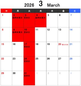 令和8年3月の営業日のご案内※臨時休業あり 2026.02.22 3月の営業日のご案内 施設修繕および点検のため、臨時休業日がございます。お客様にはご不便をおかけいたしますが、より快適にご利用いただくための作業となりますので、何卒ご理解のほどよろしくお願いいたします。